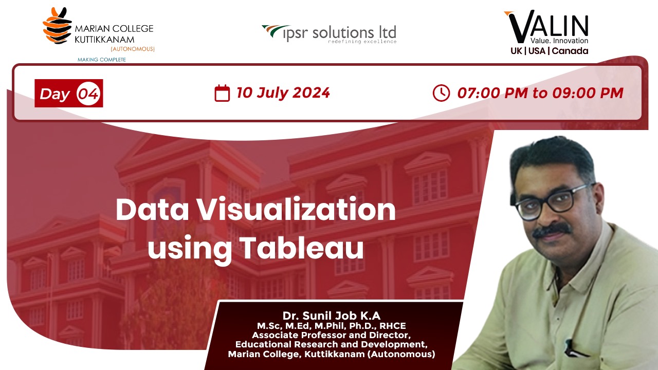 Data Visualization using Tableau was the topic of the fourth day of the Online Workshop organised by the Internal Quality Assurance Cell of Marian College Autonomous, Kuttikkanam in association with ipsr solutions limited. Dr Sunil Job was the resource person for the two-hour session.