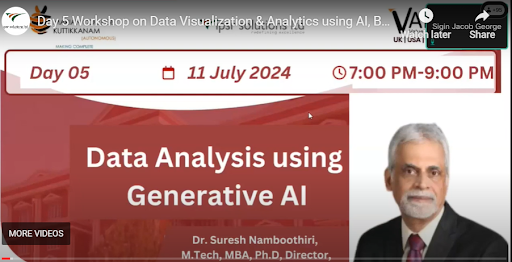 The fifth and final day’s session of the week-long Workshop ‘Data Visualisation and Analytics with Excel, Power BI, Tableau and Generative AI’ was handled by Dr Suresh Namboothiri on the topic ‘Data Analysis Using Generative AI’.