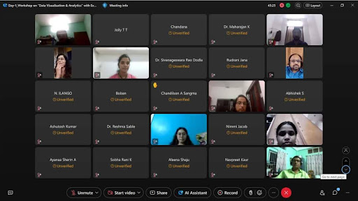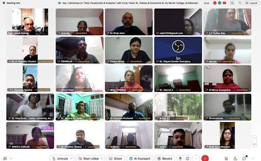 The National Level Online Workshop on ‘Data Visualisation and Analytics’ with Excel, Power BI, Tableau and Generative AI’ organised by Marian College, Autonomous, Kuttikkanam in association with ipsr solutions limited commenced on the fifth of July 2024. The function started by welcoming Rev Fr Boby Alex Mannamplackal, Manager, Marian College Autonomous, Kuttikkanam, Prof Dr Ajimon George, Principal, Marian College Autonomous, Kuttikkanam, Dr Mendus Jacob, Director - MCA, Marian College Autonomous, Kuttikkanam, Dr Thomas Varghese, Chair, Finance Program, JR Shaw School of Business, Northern Alberta Institute of Technology Canada, Dr Joby Cyriac, Vice Principal, Marian College Autonomous, Kuttikkanam, Dr Sunil Job KA, Associate Professor and Academic Mentor, Marian College Autonomous, Kuttikkanam, Mr Win Mathew John, Associate Professor and HoD, MCA, Marian College Autonomous, Kuttikkanam, Dr Suresh Namboothiri, Director, Espior Technologies, Pune, Ms Kochumol Abraham, Associate Professor, Marian College Autonomous, Kuttikkanam, and the entire participants from different parts of the country.
